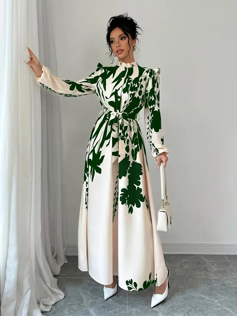Embrace effortless elegance with our Elegant Floral Print Long Sleeve Dress, a timeless piece that captures feminine charm with every detail. The A-line maxi silhouette flatters every figure, while the stand collar, waist detailing, and ruffle hem create a beautifully balanced, graceful look.